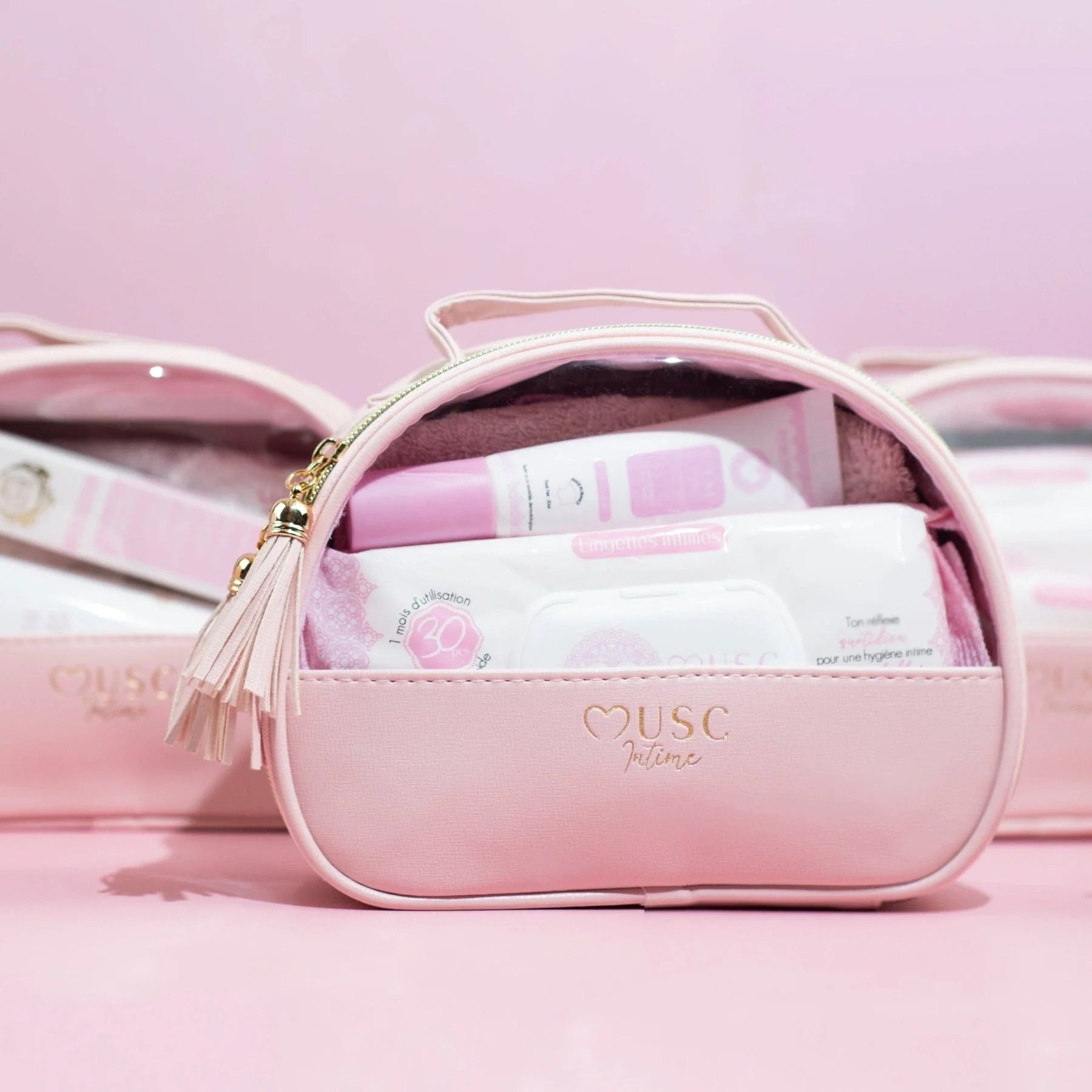 Musc Intime a créé sa propre trousse pour permettre à toutes ses beautés musquées de se démarquer et d’avoir une trousse ultra glamour réservée à ce qui ne se voit pas, mais qui est la chose la plus importante : les produits d'hygiène intime.